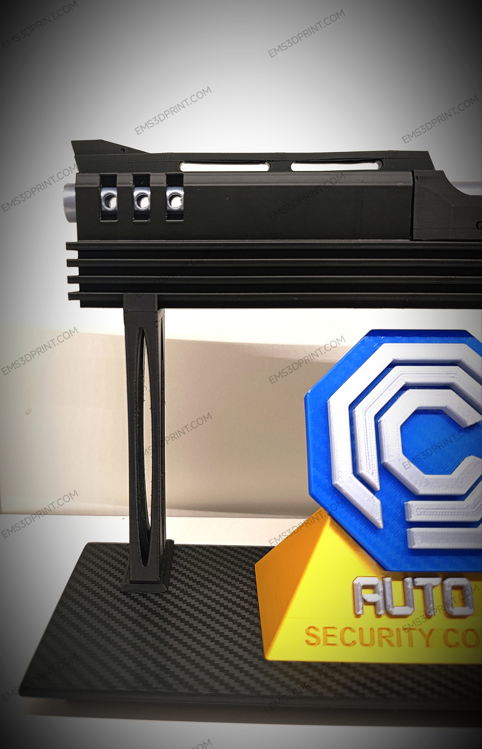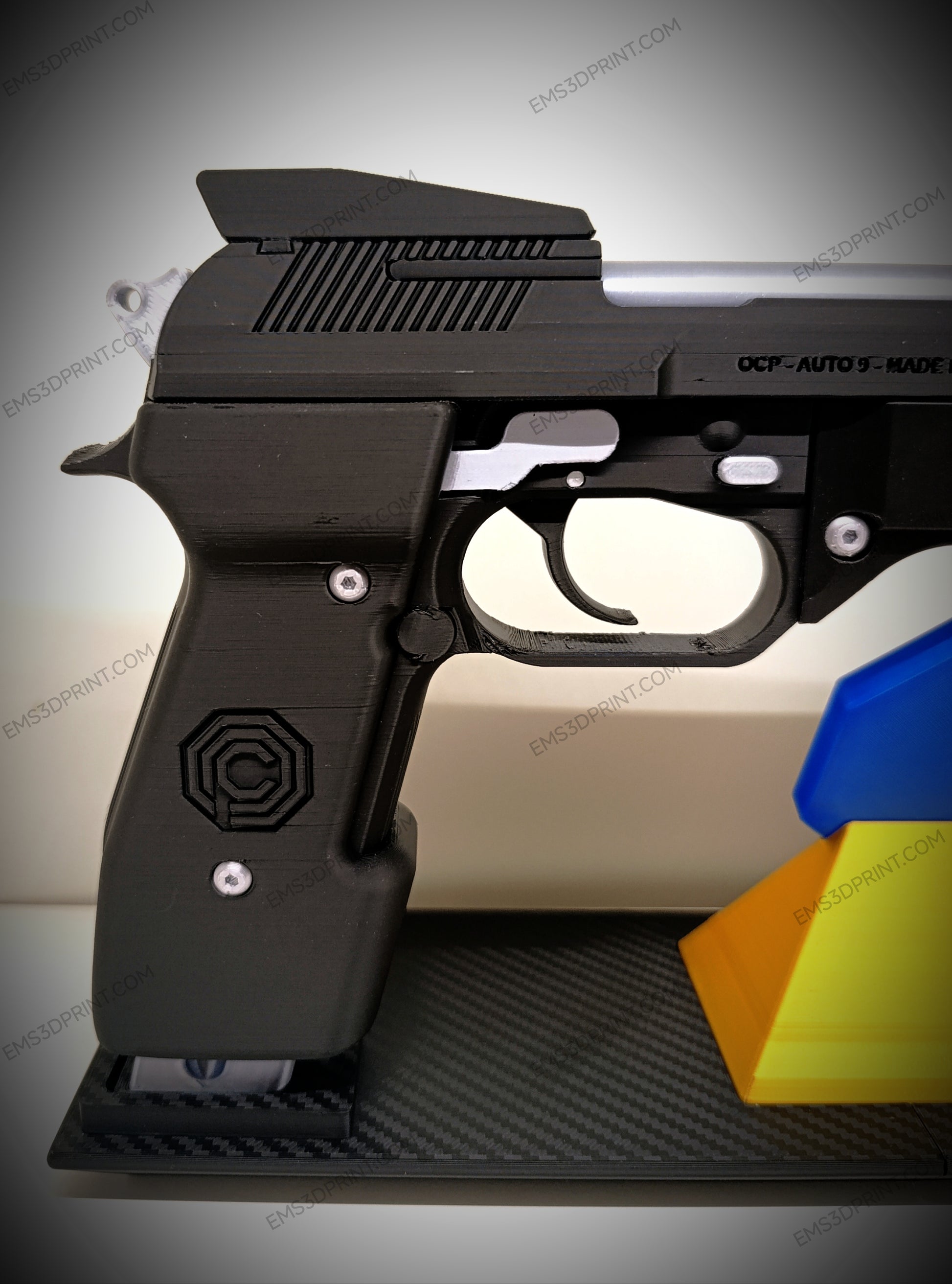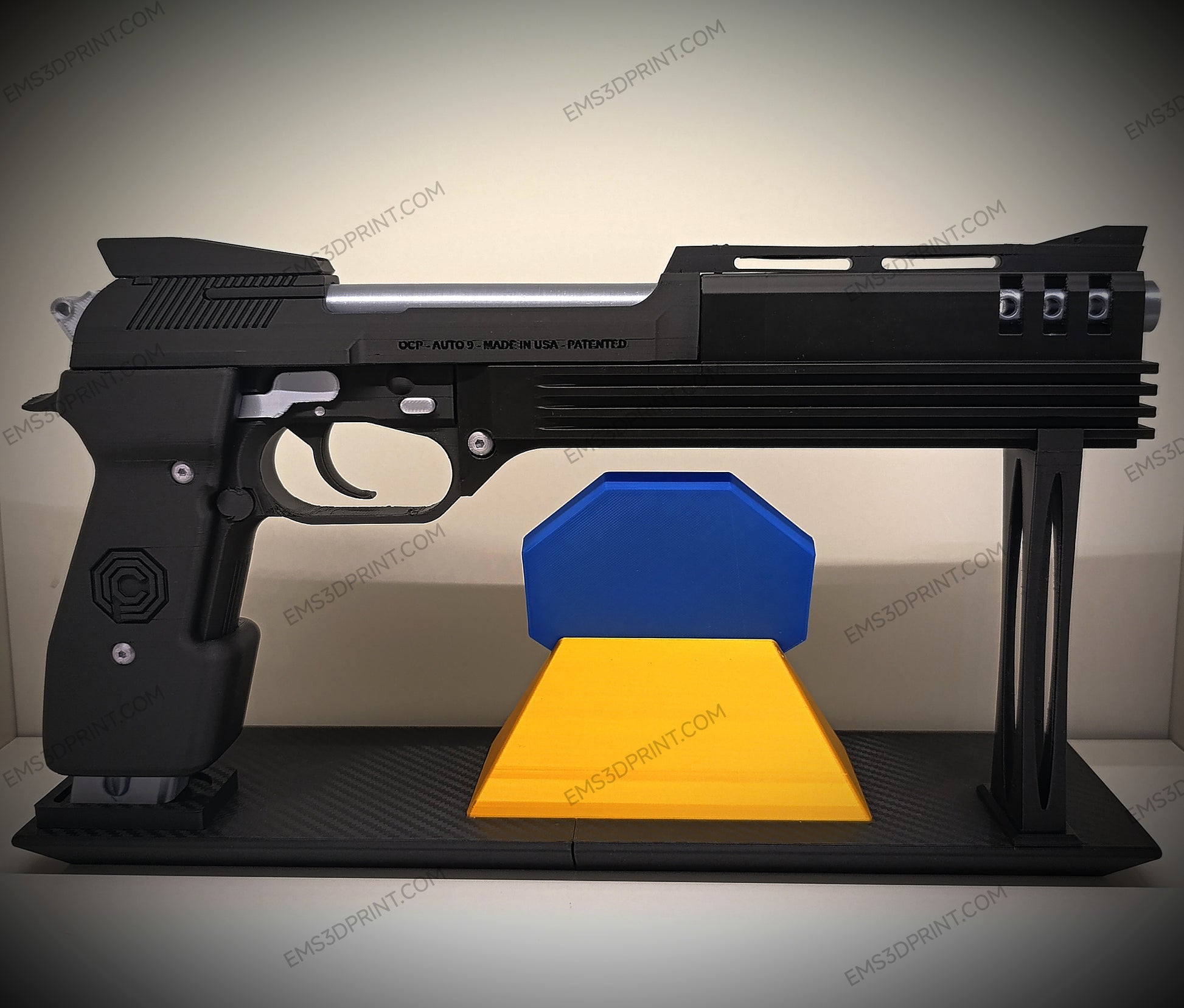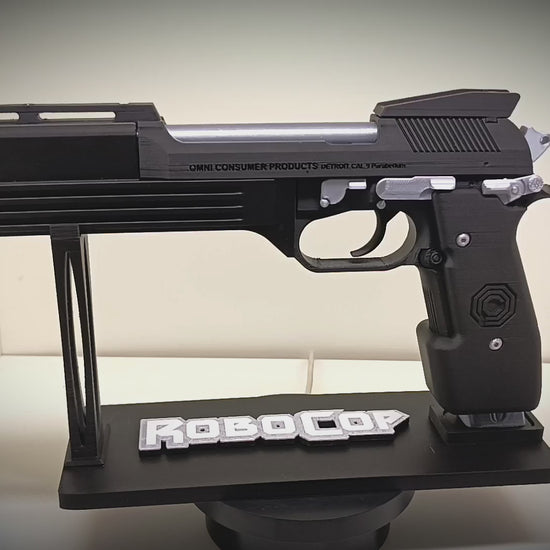 Detalles precisos, inscripciones originales (“OMNI CONSUMER PRODUCTS”, “CAL. 9mm Parabellum”) y base con logo futurista.